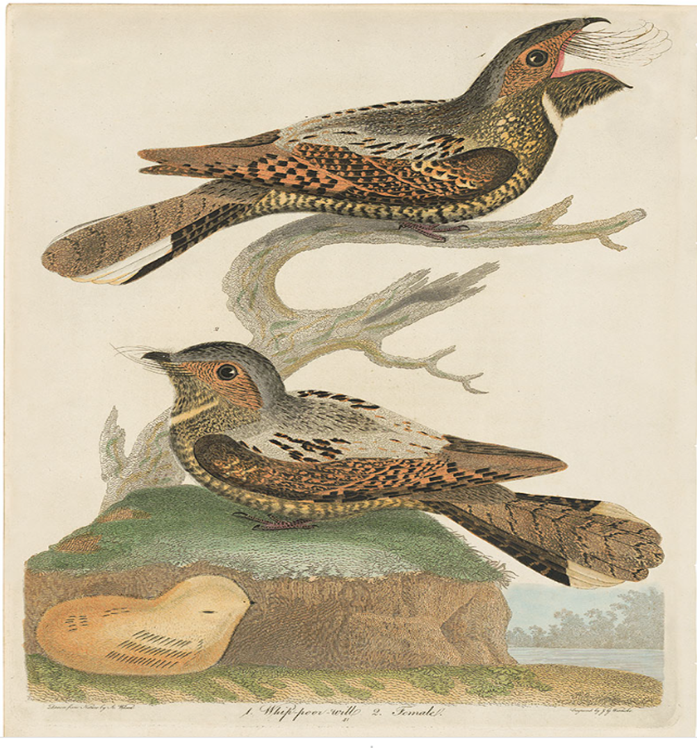 One of the many achievements of American Ornithology was to finally and definitively describe the Whip-poor-will, a common but reclusive bird of North America’s east coast. Before Wilson, early naturalists confused the Whip-poor-will with a related and more conspicuous bird, the Common Nighthawk. Confronting this confusion, Wilson writes that the Whip-poor-will has “never been described by any writer whose work I am acquainted.”