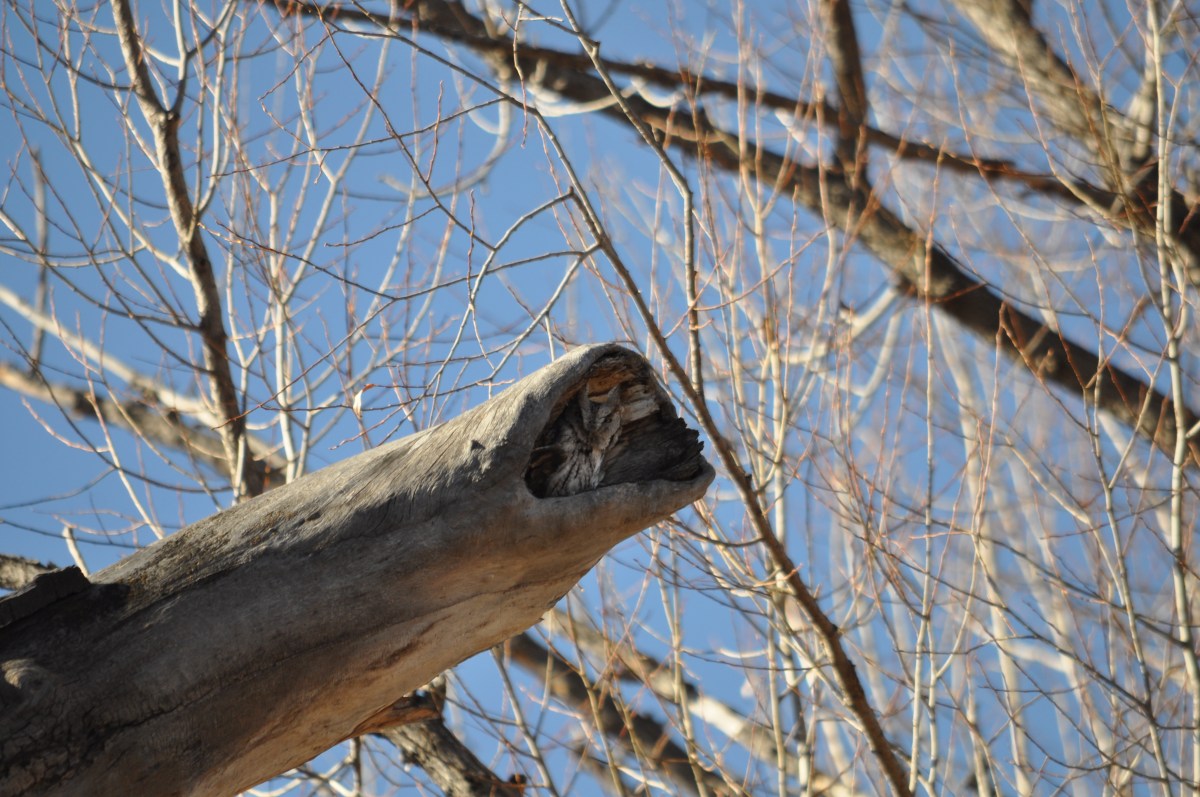 Eastern Screech Owls, too, nest in those cavities. They also roost in them. During Colorado’s cold, but sunny mornings, the owls creep to edge of the cavities and bask.